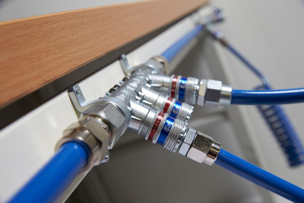 Välorganiserad och säker arbetsplats med flera tryckluftsuttag och obegränsat flöde